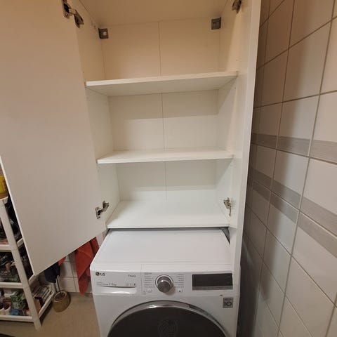 Ett vitt skåp med två dörrar, tillverkat i trä eller träliknande material. Skåpet har handtag i metall och är lämpat för förvaring i dusch- och badrum. 60x60x35 cm BxHxDj. Nypris 2019 3 410.- Säljes på grund av badrumsrenovering.