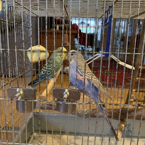 4 st jättesöta unga undulater säljes med sin bur. Det är en stor bur i trä.