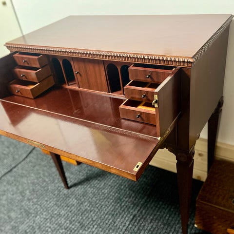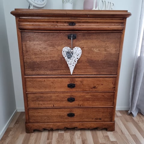 Sekretär tillverkad i trä med två lådor och flera fack för förvaring. Har en nedfällbar skrivyta och en klassisk design. Passar för användning som skrivbord eller förvaring i hem eller kontor. Tele 073-7354276