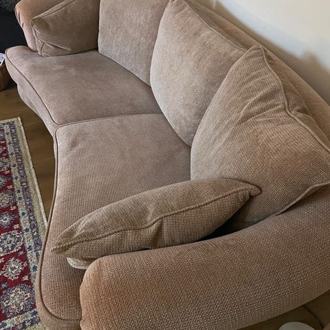 Stilren och bekväm. Ljusgrå klädsel. Metallben. Prydnadskuddar i samma material.