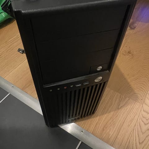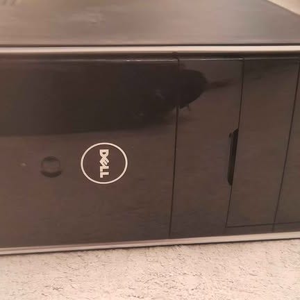 Dell stationär dator med fläktar för kylning. Datorn har en svart chassi med flera ventilationsöppningar och interna kablar synliga. Passar för allmän datoranvändning.