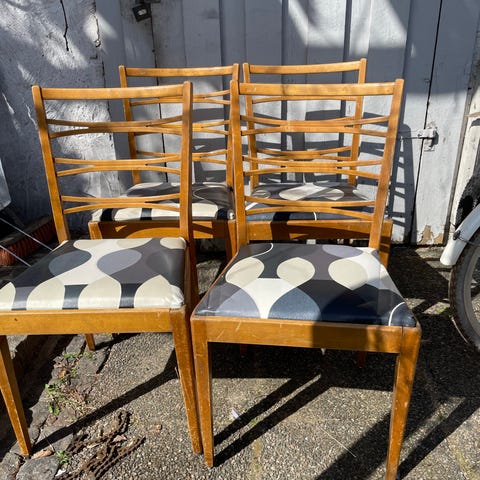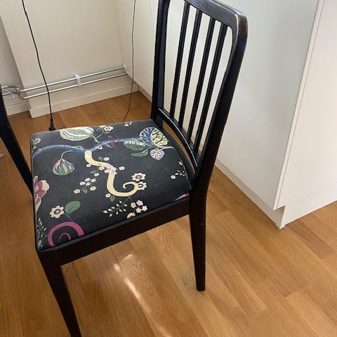 Det finns en extra stol med skadad dyna som kan fås gratis, samt en stol utan dyna (totalt 6 stolar).