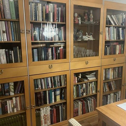 Bokhylla i ek med 3 sektioner, inklusive glasdörrar på två sektioner, öppna hyllor i mitten samt skåpdörrar och lådor på ena sidan. Passar för förvaring av böcker och andra föremål.