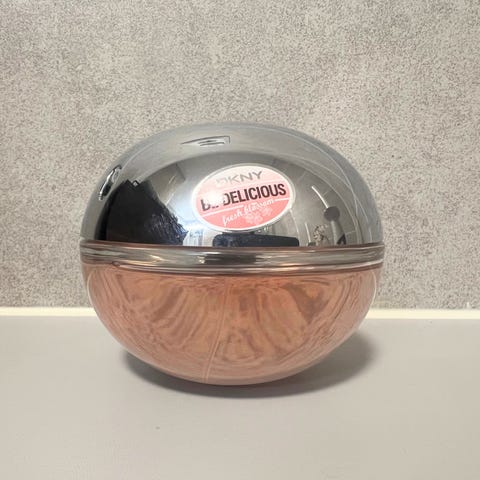 DKNY Be Delicious parfymflaska med rund form och blått lock. Flaskan är av glas och innehåller eau de toilett. Endast använt en spray.