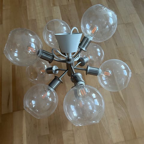 Säljer en fin taklampa i tyg, cirka 40 cm i diameter. Ger ett mjukt och behagligt ljus.