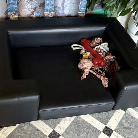 Hundbädd i stadig plast. Ca 60x37 cm i botten. Lite för stor för min hund så den har knappt använts. Nypris 399 kr på Arken zoo. Lägg en fäll eller filt i så kommer din hund trivas!