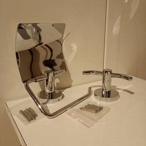 Metallkrok med monteringsbeslag och skruvar för väggmontering. Kroken har flera hakar för upphängning av föremål och är tillverkad i metall.
