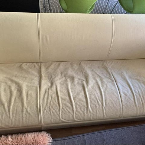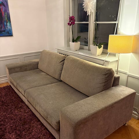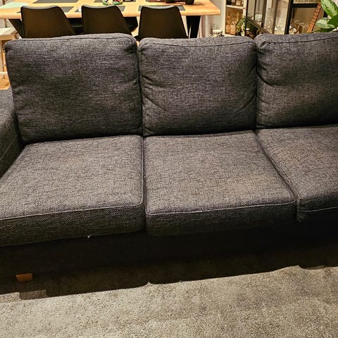 Tre sits soffa i svart tyg bortskänkes