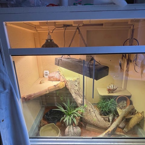 Säljes specialbyggt terrarium med unika mått, 105cm tvärsöver över och 117cm högt utan bänk, Med bänk och ihopbyggt är det 179cm högt.