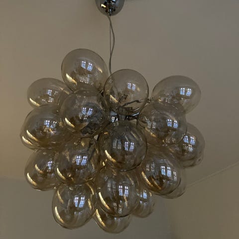 Taklampa metall “Satelite” Rydéns. Nypris 4500kr. En av satelliterna har sjunkit lite men det är något som man inte lägger så mycket märke till. Lampor följer med, men man kan köpa till snyggare lampor om man vill. Därav priset 1500kr.