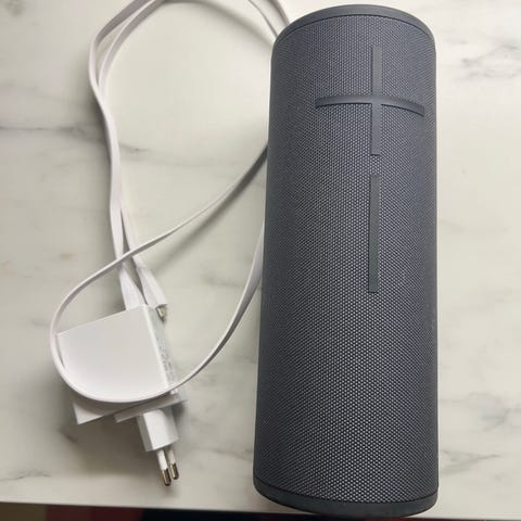 Bluetooth högtalare i blå och svart färg med vattentät design. Kompakt storlek med inbyggda knappar för kontroll. Utrustad med laddningskabel och strömadapter. Lämplig för användning i fuktiga miljöer som badrum eller utomhus.