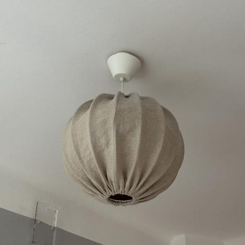 Beige lampskärm med veckad design, cirka 30 cm i diameter och 27 cm i höjd. Tillverkad i tygmaterial med struktur. Passar för standard lampupphängning.