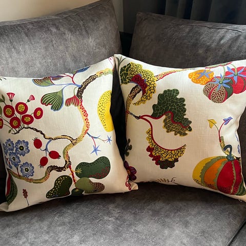 Tyget är ritad av Estrid Ericson från svenskt tenn. Baksidan är i enfärgad linnetyg. Kuddfodralen är hemsydda med överlock och har en dragkedja i botten.