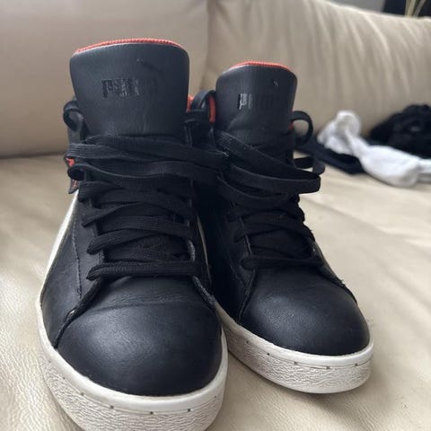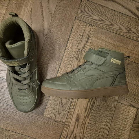 Puma barnskor för unisex i storlek 34. Skorna är gröna och har en robust design med kardborreband och snörning för justerbar passform. De är tillverkade med material som ger värme och komfort, lämpliga för utomhusbruk under kallare väder.
