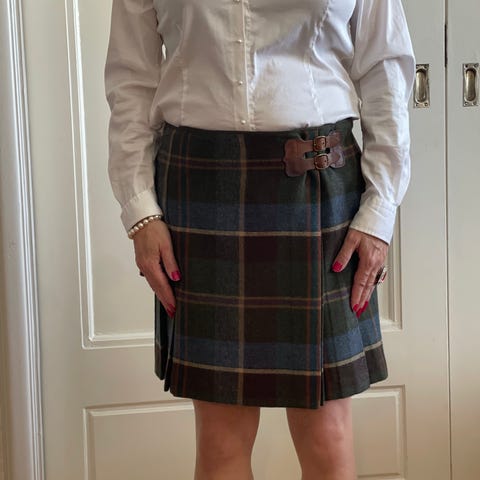 Brun ull - och sidenblandning. Kavajen är hundtandsmönstrad. Fyra knappar fram. Endast använd en gång. 1 ägare. Jag har köpt den ny i affär. Tyget: 100% ull. Modellen bär storlek; 10. Detta motsvara ungefär storlek 42. Längd: ca 65 cm. Bröst: ca 40 cm. Ärm: ca 50 cm.