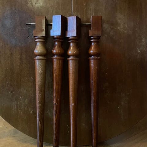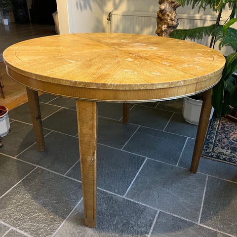 Bordet är i gott skick, men bordsskivan är precis nyslipad vilket förklarar färgskillnaden mellan ben och bordsskiva. Då den är nyslipad, så är bordet redo för att bli målad i den färg ni föredrar.