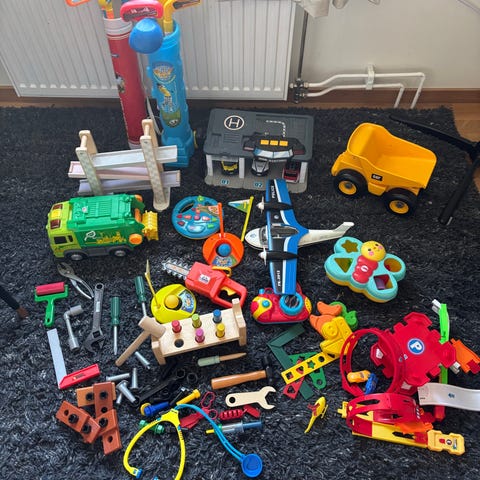 - Leksaksfordon byggarbetsplats. 2 radiostyrda lastbilar och 1 lyftkran m.m. Allt fungerar. Laddade med nya batterier. Köpt på Biltema.
