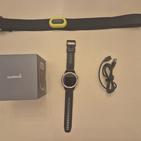 Garmin smartklocka för unisex med rund urtavla och beige armband. Klockan har digital display och sensorer för hälsomätning.