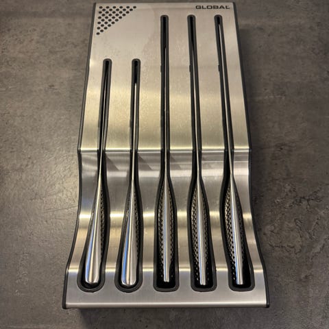 Global kockkniv tillverkad i molybden-vanadiumstål. Kniven är designad för köksbruk och har ett handtag i rostfritt stål med ett mönster för bättre grepp. 25 cm blad som är flexibelt. Riktigt vass och fint skick