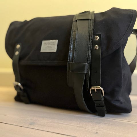 Sandqvist messenger/tote "Jussi" i militärgrönt kanvas. Hållit riktigt bra genom åren. Rymmer 18L och funkar fint för en 15-tums laptop, träningskläder, matlåda mm.