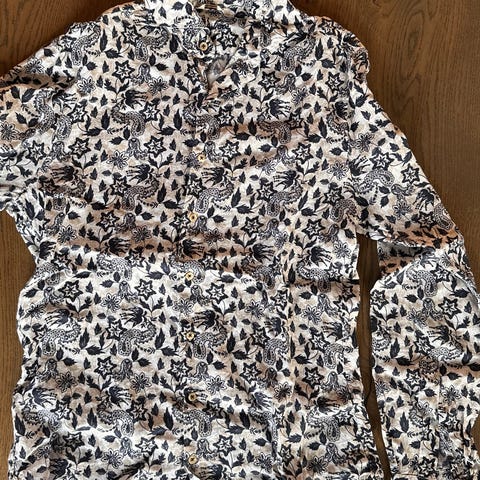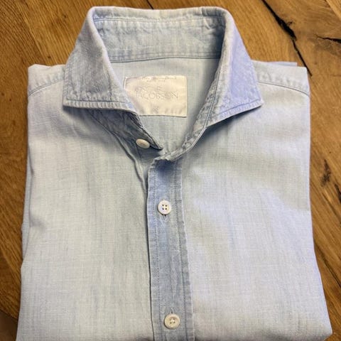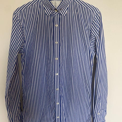 Oscar Jacobson skjorta i blått med vit rand, storlek 38. 100% bomull. Skjortan har en klassisk krage med en elegant rund skjortnål,en snygg detalj som ger kragen ett unikt och stiligt intryck.
