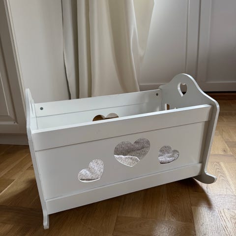 Charmig vintage docksäng från ca 1950-tal, handgjord i Finland och perfekt för samlare eller som en nostalgisk inredningsdetalj i barnrummet.