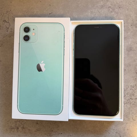 Apple iPhone 11 med 128 GB lagringskapacitet i svart färg. Mobiltelefon med två bakre kameror varav en är sprucken men det är utsomningskameran och den går fortfarande att använda bara att det blir lite suddigt. Andra slitaget är på skärmen där det har börjat komma konstiga streck men touchen funkar fortfarande och det påverkar oftast inte synen då man inte trycker där nere så ofta.