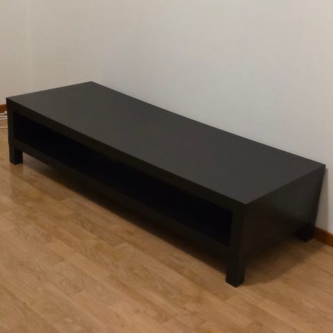 Tv-bänk byggd för SUB och två styck monoblock/slutsteg. Luckan i mitten är fäst med magneter och de två på sidorna med gångjärn. Fint skick, finns i Kallax by.