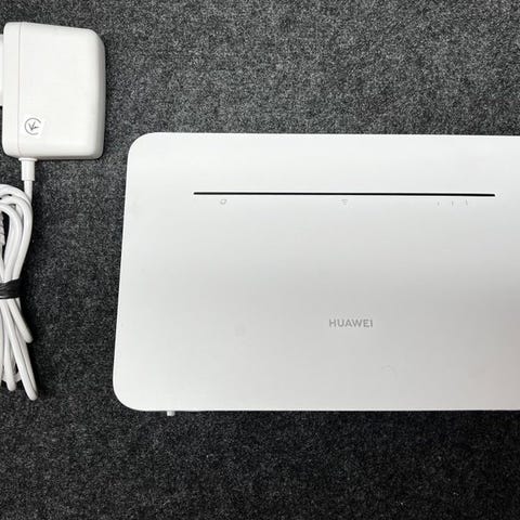 Router med flera portar för nätverksanslutning. Utrustad med strömadapter och indikatorlampor för nätverksstatus. Wifi