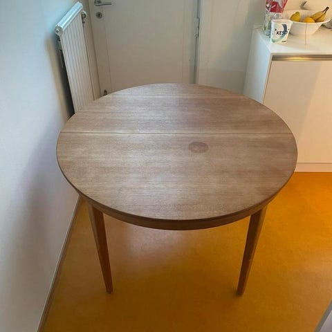 Material: Skiva fanerad med teak på spånskiva. Kantlist av teak. Ben av betsad bok.