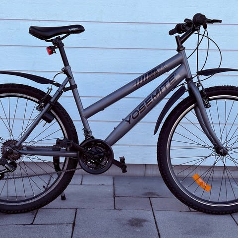 Dämpad framgaffel, ringklocka, stöd, fotbroms och handbroms