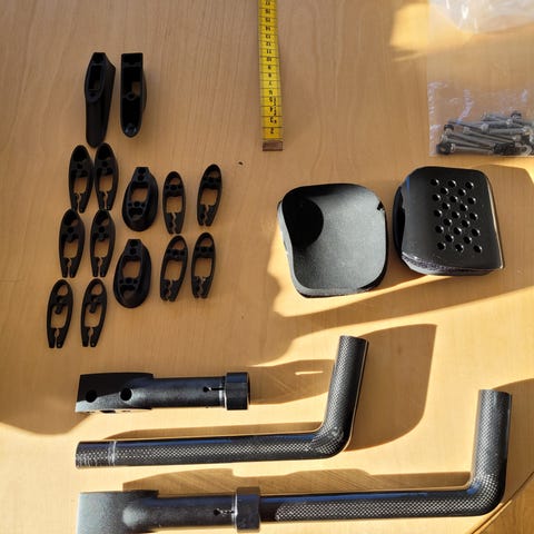Säljer en flaskhållare med fästen för att monteras mellan aero bars. Flaskan hamnar då horisontellt och blir då placerad mellan armarna, vilket är optimalt för att minska luftmotstånd. Sparsamt använd och i fint skick.