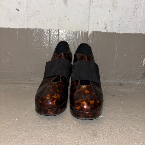Primark klackskor i storlek 36 med beige färg. Skorna har öppen tå och öppen häl med rem bak. Klacken är hög och dekorerad med metallnitar. Materialet är mjukt och lämpligt för dam.
