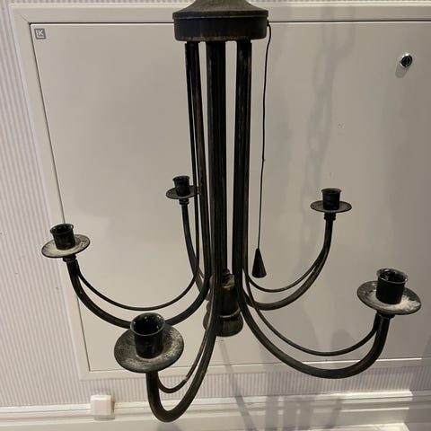 Modern ljuskrona i svart metall med tre rökfärgade glaskupor skapar en varm stämning i rummet✨