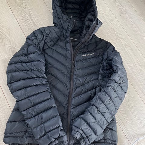 Peak Performance dunjacka i svart/blå färg, storlek XS för dam. Jackan är modell womens Frost Down Hoddie och är riktigt fin och lätt dunjacka.