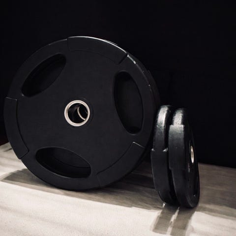 Träningsutrustning bestående av olika vikter, skivstänger och tillbehör. Innehåller flera viktskivor, raka och curl skivstänger samt en pressbänk för styrketräning. Material och exakta vikter varierar mellan delarna.