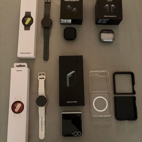 Galaxy Z Flip 7 (512 gb minne) tillsammans med en Galaxy Watch 8. Dessa har endast packats upp en gång för att inspektera, så allt är sprillans nytt.