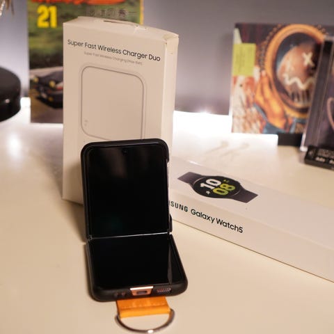 Galaxy Z Flip 7 (512 gb minne) tillsammans med en Galaxy Watch 8. Dessa har endast packats upp en gång för att inspektera, så allt är sprillans nytt.