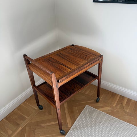 Serveringsvagn på hjul i teak, troligtvis från 50 tal.