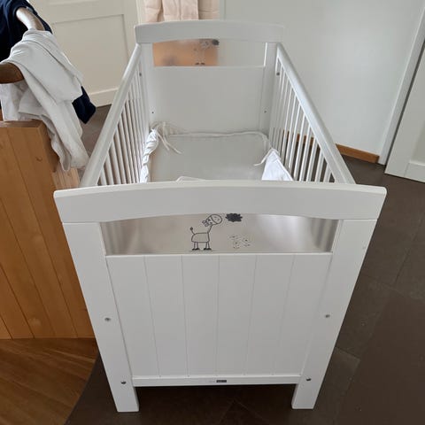 Spjälsäng från Kaxholmen. Några märken på kanten efter babyvakt (se bild nummer två). I övrigt i mycket gott skick. Madrass och spjälsskydd ingår.