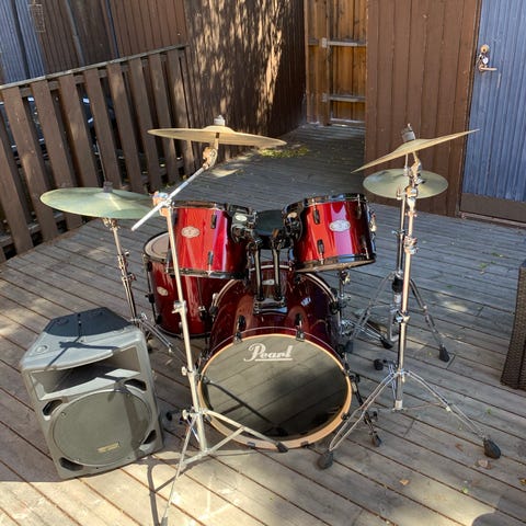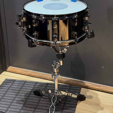 Trumma med metallkropp och stativ. Trumman visar tecken på användning på trumskinnet.