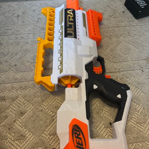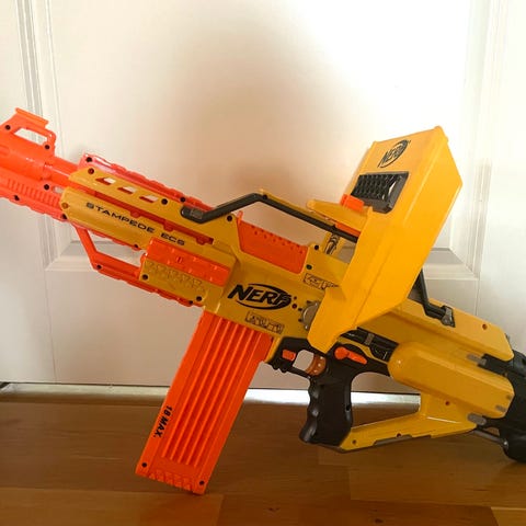 Nerf Scravenger barnleksak skjutvapen i orange och grå färg. Tillverkad i plastmaterial. Leksaken har avtagbart magasin och tillbehör, inklusive en sikte med ljusfunktion. Utformad för barnlek.