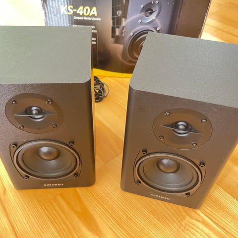 KRK Rokit 5 studiemonitorer med 5-tums högtalare. Inkluderar Audio-Technica ATH-M50x över-ear hörlurar med coiled kabel för ljudövervakning. Ljudinterface Komplete Audio 2 med volymkontroll och anslutningar för mikrofon och hörlurar. Uppställning lämpad för ljudproduktion och musiklyssning i hemmastudio.