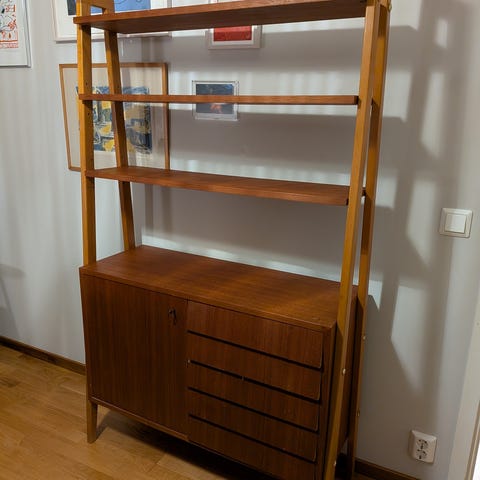 Väldigt fint hyllsystem / bokhyllor i modellen Norrland av Alf Svensson från Bjästa Möbelsnickeri. Tillverkad på 60-talet med fanér i Teak.