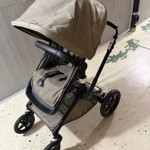 Bugaboo barnvagn i grått tyg. Vagnen har en justerbar sufflett och en rymlig förvaringskorg under sitsen. Den är utrustad med säkerhetsbälte och vadderad insida för komfort. Passar för barn och är konstruerad för att ge stöd och skydd under promenader. Fint skick, ej solblekt. Spår av användning givetvis och bärhandtag saknas men 2 åkpåsar skickas med. Liggdelen är nästan oanvänd.