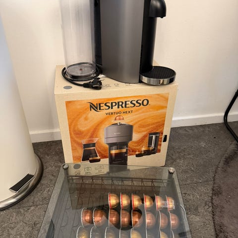 Nespresso Vertuo plus kapselkaffemaskin i svart färg. Maskinen är designad för att brygga kaffe med kapslar och har en kompakt form som passar för hemmabruk eller kontor. Utrustad med en vattentank och en koppplattform.
