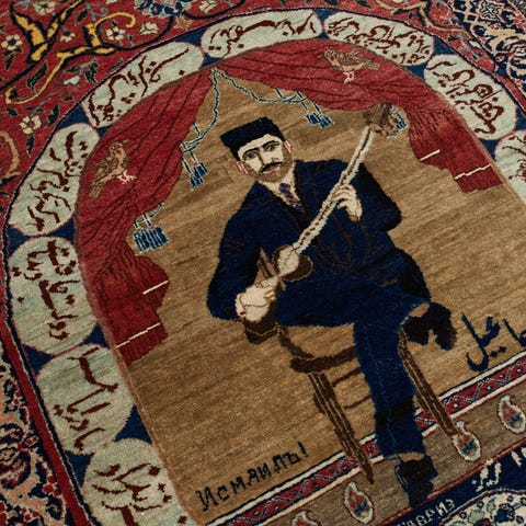 Exklusiv och ovanlig Kirman pictorial rug (sydöstra Persien), daterad till omkring 1910. En riktig bildmatta med mörkblå botten och ett mytologiskt motiv som ofta benämns “La Danse d’une nymphe” – flöjtspelande man, dansande kvinna, putti som spelar musik, musikinstrument samt rikt omgiven av fåglar, blommor och träd i polykroma färger.