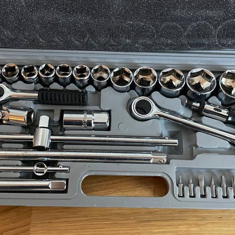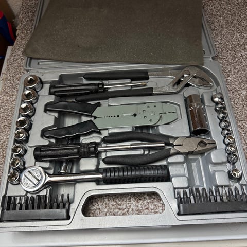 Verktygssats i plastväska med skruvmejslar, tång och kniv