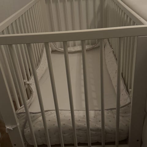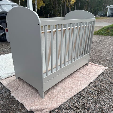 En spjälsäng i bra skick. Det finns en skummadrass, en madrasskydd och 2 dra-på-lakan.