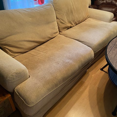 Beige soffa med avtagbar klädsel.